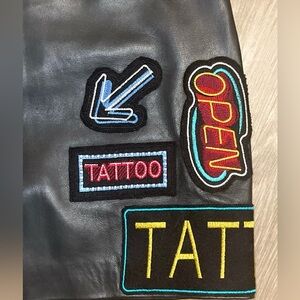 • Embroidered patches: “Tattoo,” “Open,” arrows, rose, skull