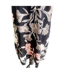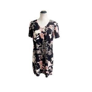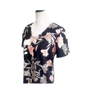 This is a Nicole Miller short sleeve sheath dress in black with a floral pattern. It is made of a linen blend twill fabric, featuring a V-neck and a pullover closure. The dress is in size Small and suitable for occasions like travel, parties, and casual wear, with a theme of beach and summer. It is machine washable and ideal for the summer, fall, and spring seasons.