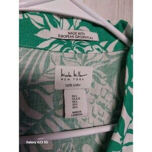 Nicole Miller Linen Top Women's Large Button Up Shirt Short Sleeve Floral Green