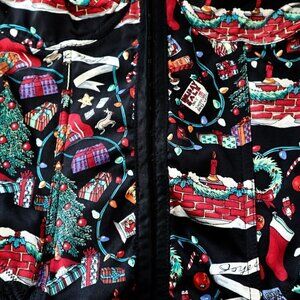 Adorable and sexy vintage teddy with hook and eye close up the front and underwire cups. Has an adjustable halter strap that is removable. Black holiday themed sandwashed silk with black lace trim. Snap close crotch. Amazing vintage find!
