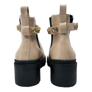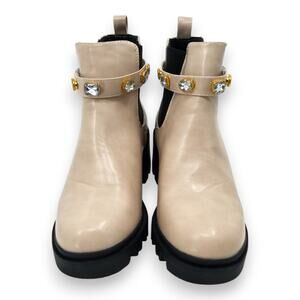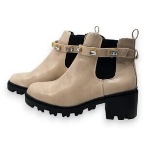 Nicole Miller Lug Sole Faux Leather Beige Jeweled Chelsea Bootie Size 10