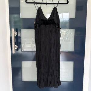 Double layered creased silk crepe with velvet insert and amazing beading detail at the bust, spaghetti straps.