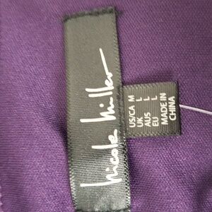 Nicole Miller long-sleeve top in a rich purple hue with burnout black velvet floral design. Features a ruched design for added style and a fitted look.