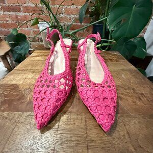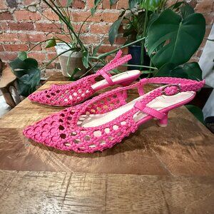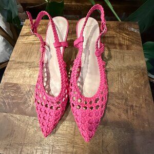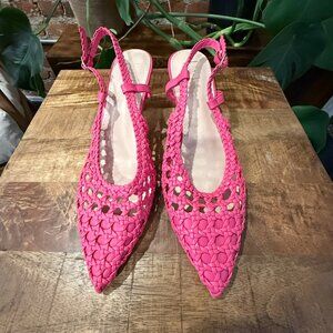 Step into style with these stunning Basket Weave slingback flats. Featuring a unique woven design, these shoes are both fashionable and breathable, perfect for any season. The vibrant pink color adds a bold statement to your outfit, while the pointed toe and slingback strap provide a chic and comfortable fit. Brand new w/o tags. Never worn.