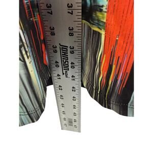 Striking and artistic Nicole Miller New York sheath dress featuring a bold multicolor abstract print. Crafted in the USA from a silky stretch fabric with a smooth polyester lining, this sleeveless dress flatters with a structured silhouette and back vent for ease of movement. Eye-catching color palette with red, blue, yellow, and teal accents against a black base — perfect for statement workwear, cocktail events, or art-inspired fashion lovers.