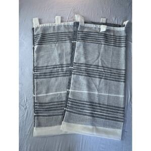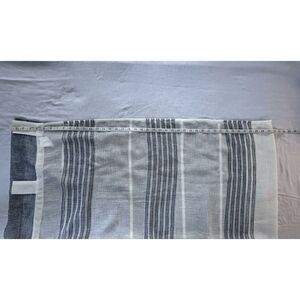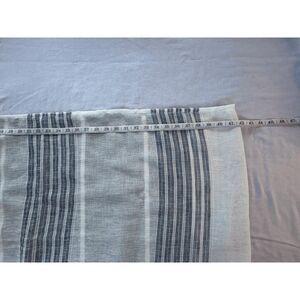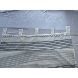 This is a set of two sheer panel curtains with blue and white stripes. They are in great condition and are 100% polyester. They measure about 84 inches long and right about 37 inches wide.