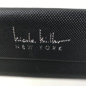 Nicole Miller New York eyeglass or sunglass case in black. Has olive/lime green velveteen fabric on the inside. It is a triangle case but can also fold flat. Perfect in your purse! When it is in the triangle , it is very sturdy. Excellent preowned condition.