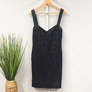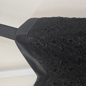 This elegant black mini dress by Nicole Miller perfect for a night out. The sleeveless sheath design features a flattering sweetheart neckline, offering a chic and sophisticated look. Its form-fitting silhouette ensures a glamorous appearance for any cocktail event. Hook and Eye back closure. Lace cutouts. Great for a wedding or dinner date.