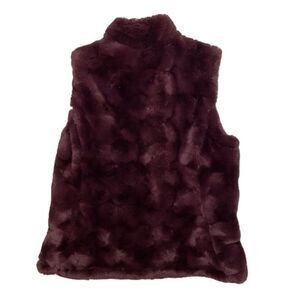 Burgundy, red, wine colored reversible, faux fur, puffer vest by Nicole Miller Original in a women's size small. One side is a very soft faux fur and the other is a quilted puffer vest. Full front zip. High neck. Pockets on each side. Machine washable. Approximate measurements shown in photos. In great pre-owned condition with little to no signs of wear.