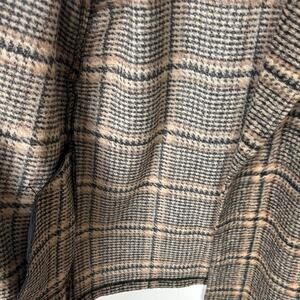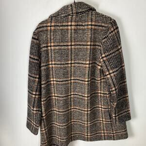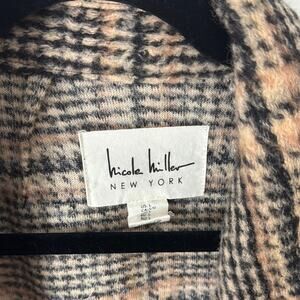 Gently Used Nicole Miller New York Peacoat. This is a women's large. Tan, white, and black plaid like design throughout. Open front. Side pockets. 39% wool, 32% polyester, 29% acrylic.