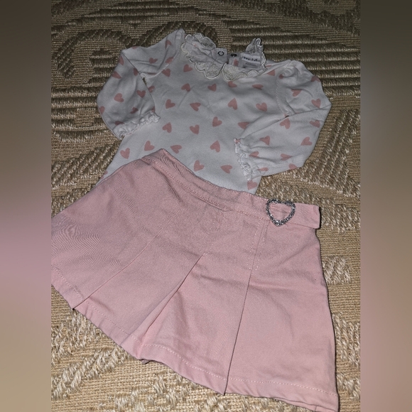 Charming pink skirt with heart-patterned top. Ideal for fun outings.
