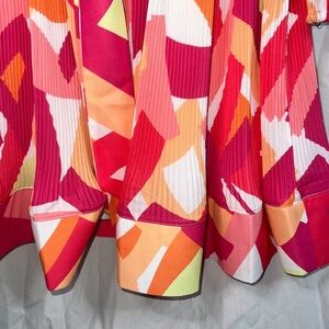 Nicole Miller Pink and Orange Patterned Pleated Mini Dress with Bishop Sleeves