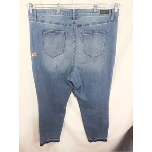 Nicole Miller plus size jeans 20, high rise skinny jeans with floral embroidery, embroidered denim jeans plus size, Nicole Miller SOHO jeans 20W, light wash stretch jeans plus size, boho chic floral jeans curvy, feminine embroidered skinny jeans, ankle length floral jeans 20, Nicole Miller SOHO denim for women, trendy flower detail jeans plus, light blue jeans with pink flowers, spring floral denim for curvy women, raw hem skinny jeans embroidered, stylish jeans with floral embellishment