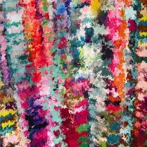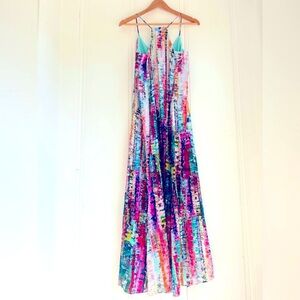 Vibrant maxi dress with multicolor abstract watercolor design. Silky soft. Built in bralette. Pockets. Light and flowy.
