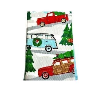 Each towel features a wintry scene and red vintage truck, Travel Van, and a Woody Station Wagon all carrying Christmas Trees.