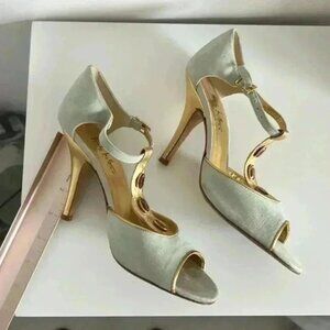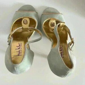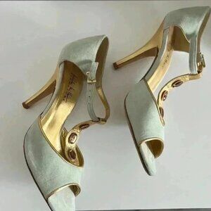 Nicole Miller Signature, mint green and gold heels with smoky topaz stones.
