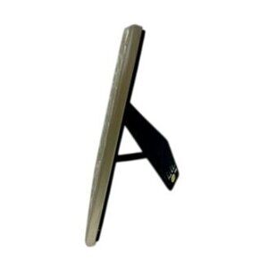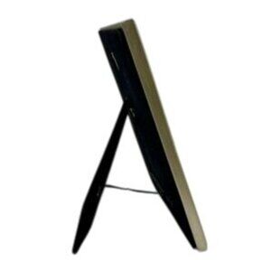 It has a black velvet backing with secure metal clips and an easel stand, allowing for vertical or horizontal display.