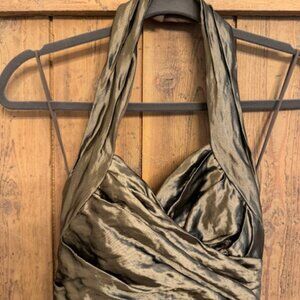 Nicole Miller Size 4 Ruched Cocktail Dress, Goldish / Olive Green color, halter top with metalic buttons at the back of the halter neck.