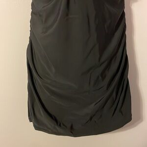 Nicole Miller Studio Twist Bandeau Swim Dress Black One Piece Swimsuit size M. Very good preowned condition. Little boning on sides of chest area. Ruched sides. Adjustable straps. Cut out in the back. See pictures for approximate measurements.
