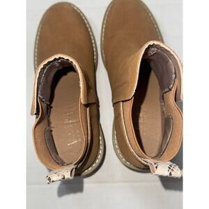 Short brown boots. Faux suede. Faux snake skin boot strap on back. Pull on style. Excellent preowned condition EUC with very little signs of wear. Professional, highly rated seller, quick shipper, open to offers!