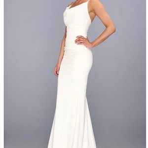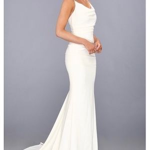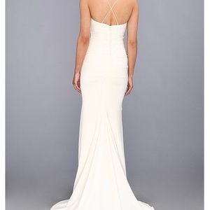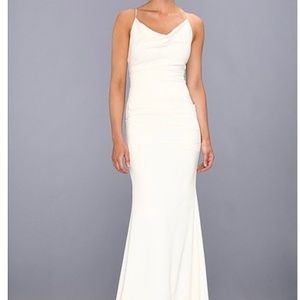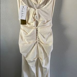 Gorgeous cream Nicole Miller “Tara” gown, size 0. Never worn, tag still attached. Ruching in the waist creates a beautiful hourglass shape and the button detail in the back is stunning! Originally $1200.