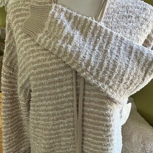 Chic V-neck with textured pattern. Ideal for stylish layering. Hood with adjustable ties. Classic sweatshirt style. Sophisticated and stylish.