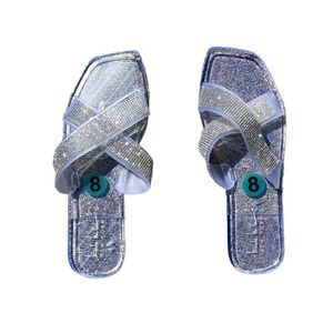 Clear see through flat sandal with a square toe and chris cross rhinestone straps that shines in the sun and with movement.