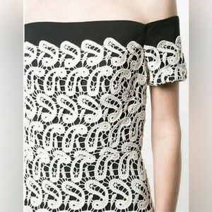 Nicole Miller Boutique Exclusive White over Black Crochet Overlay Bardot Midi Dress, US Size 12 ~ New with tags! Design details: Lace overlay off-the-shoulder style with inner gripping at neckline, paisley design, asymmetrical mermaid hem. Center back zipper with hook-and-eye closure. Perfect for evening, weddings, christening or any formal/cocktail event. Dress is stunning and photos do not do it justice!