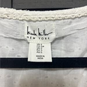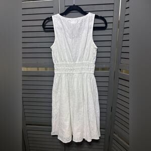 Nicole Miller white dress with eyelet detailing. Sleeveless. Elasticized ruched waist. Pair with a jean jacket for Fall. Size small. Smoke free home.