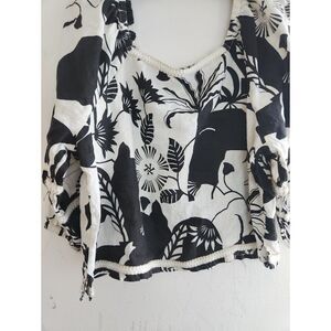Nicole Miller Women Black White Floral Off The Shoulder 100% Linen Blouse Large