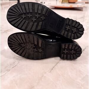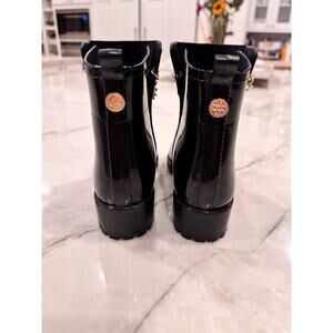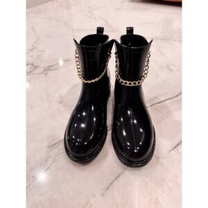 Nicole Miller Womens Short Black Shiny Rain Boot Ankle Bootie with Gold Chain Accent Size 6. Chic rainy day style! Waterproof. Pull-on Slip-on style. Pre-loved condition.