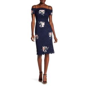 Nicole Miller Women's Strapless Laced Floral Off The Shoulder Midi Dress Navy 6