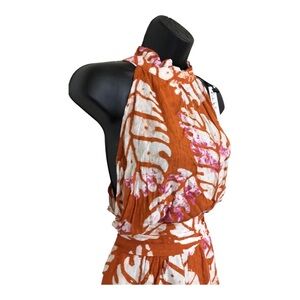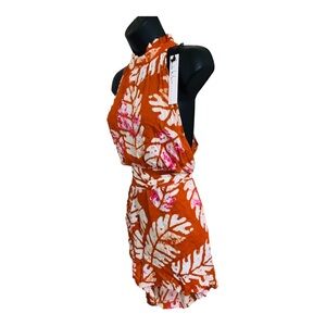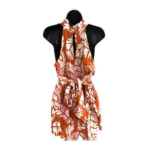 Nicole Miller brown white multi ruffled neck fitted belted tie dye romper sz M