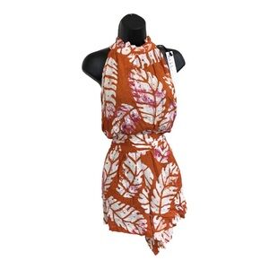 Nicole Miller brown white multi ruffled neck fitted belted waist tie dye romper size medium new