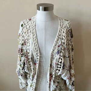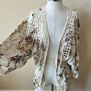 Beautiful floral embroidered lace inset kimono shawl in excellent used condition. No size tag. Fits like a S/M. Shown here on a size small dress form