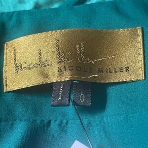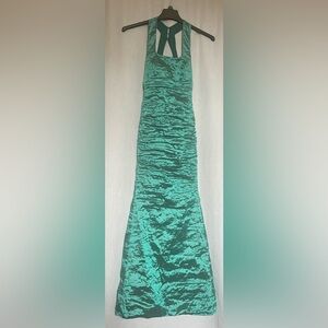 Fun, metallic look Green. Gathered/ruched. Fabric has some stretch. Lined. Hidden zipper in back. Three hook and eye closures in back. Comes with small pads in breast area. Back of lining and inside of back hem have snags. Likely from heels. Outside of hem is fine. Great for prom, wedding, holidays