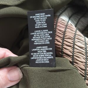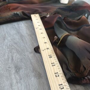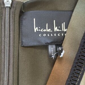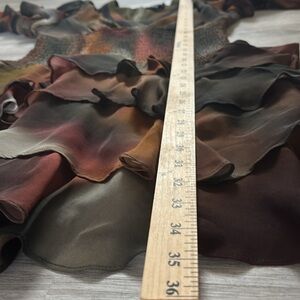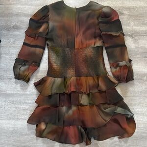 Nicole Miller dress, size small. It features a V-neckline with black trim and long sleeves with elasticated cuffs and tiered ruffles. The bodice is smocked, leading to a layered, ruffled mini skirt. The dress showcases an earthy-toned tie-dye pattern in shades of brown, green, and red.