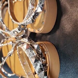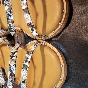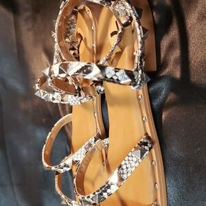 Nicole Miller triple strap, ankle wrap snakeskin print sandals