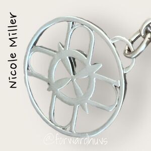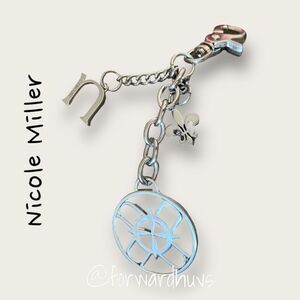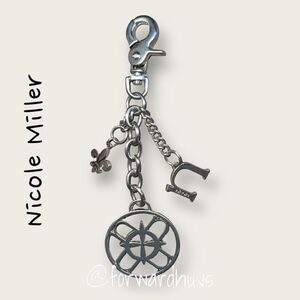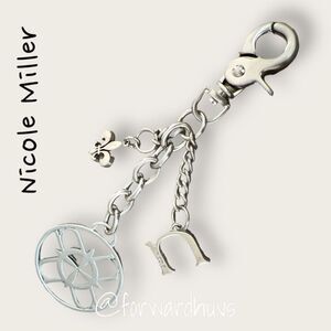 Among the charming details are a fleur-de-lis, an engraved letter "N" representing Nicole Miller, and a larger compass-like charm. These elements combine to create a unique and eye-catching bag charm that is sure to draw compliments wherever you go.