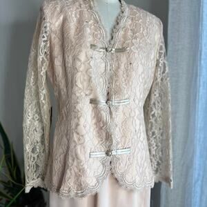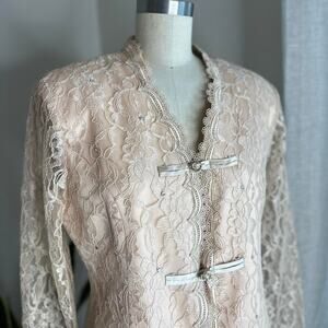 Beautiful vintage two-piece skirt suit in a romantic blush tone. Features a fitted lace overlay jacket with scalloped trim, satin frog closures, and a matching high-waisted pencil skirt. Perfect for weddings, formal events, or vintage lovers seeking timeless elegance.