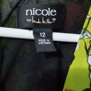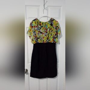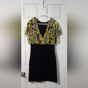 This elegant sheath dress by Nicole by Nicole Miller showcases a vibrant yellow and green floral bodice paired with a solid black ruched skirt. The sleeveless design features flutter sleeves and a V-neckline, making it an ideal choice for a cocktail night out.