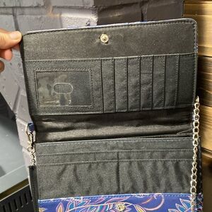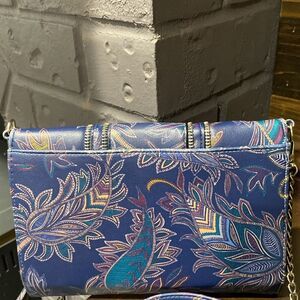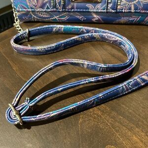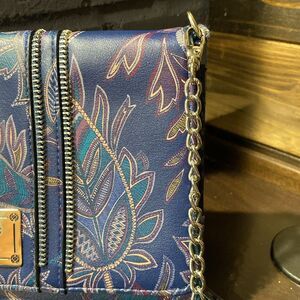 Zipper detailing, floral purple and dark blue, adjustable strap, chain strap, removable strap to turn into clutch, interior has two large compartments as well as a wallet card feature on top GUC