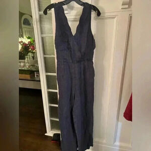 Nicole miller 100% linen blue jumpsuit with tie belt. zip up back wide leg.