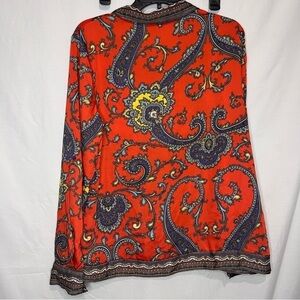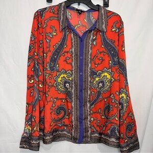 Nicole miller paisley button down blouse size large. Orange and purple paisley print 100% polyester. Blouse is in excellent condition.