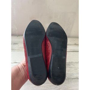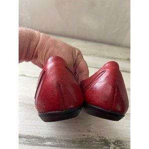 Nicole woman’s red braided leather slip on shoes Size 6.5M. Beads on tassels at toe show some wear, but otherwise good pre-owned condition.