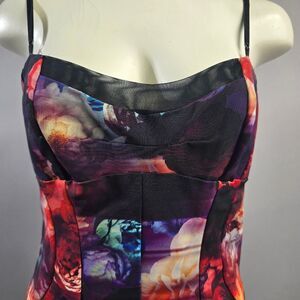 Bold abstract print with a mix of vibrant colors. Spaghetti straps and fitted silhouette. Perfect for a night out.