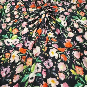 Beautiful floral dress from Nicole Miller. Lightweight, short sleeved; v-neck with twist at the bust. Zip closure at the back; easy, flowing A-line fit.