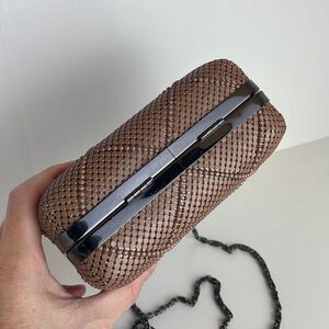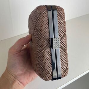Nicole Miller Blush Pink Metal Mesh Chain Strap Structured Frame Evening Bag / Clutch. Features metal structured frame, blush pink (slight rose gold) metal mesh overlay, rectangular rhinestone accented closure, chain crossbody strap (it is on hinges and can be tucked inside to carry bag as a clutch), satin lining with one slip pocket, sweet rectangular shape. Gently carried with some scratches/dings on the metal frame and hardware. Get holiday party ready with this perfect little evening bag!