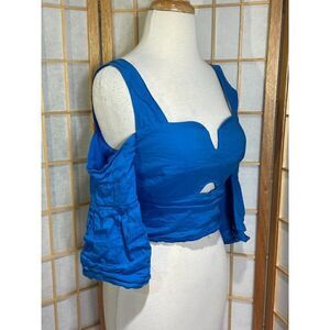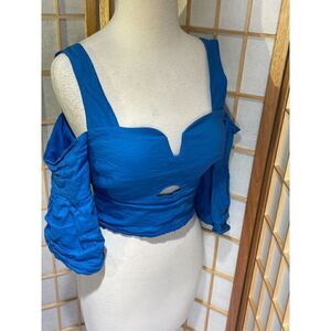 Beautiful and bright cropped off shoulder blouse from Nicole Miller's Artelier line. Size small. Cutout detail. Ruffle sleeves. Fully lined. 77% cotton, 11% nylon 9% metal, 3% elastine. Lining 100% polyester. Style BG10241. Dry clean. Made in USA. Excellent condition. Nonsmoking home.