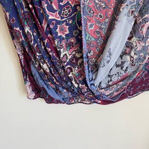 Nicole miller, multi color print 100% viscose blouse - size medium. Very gently worn. Ty closure in front and gathered bottom. Measures 26 inches long and 19 inches armpit to armpit. Style 006002.
